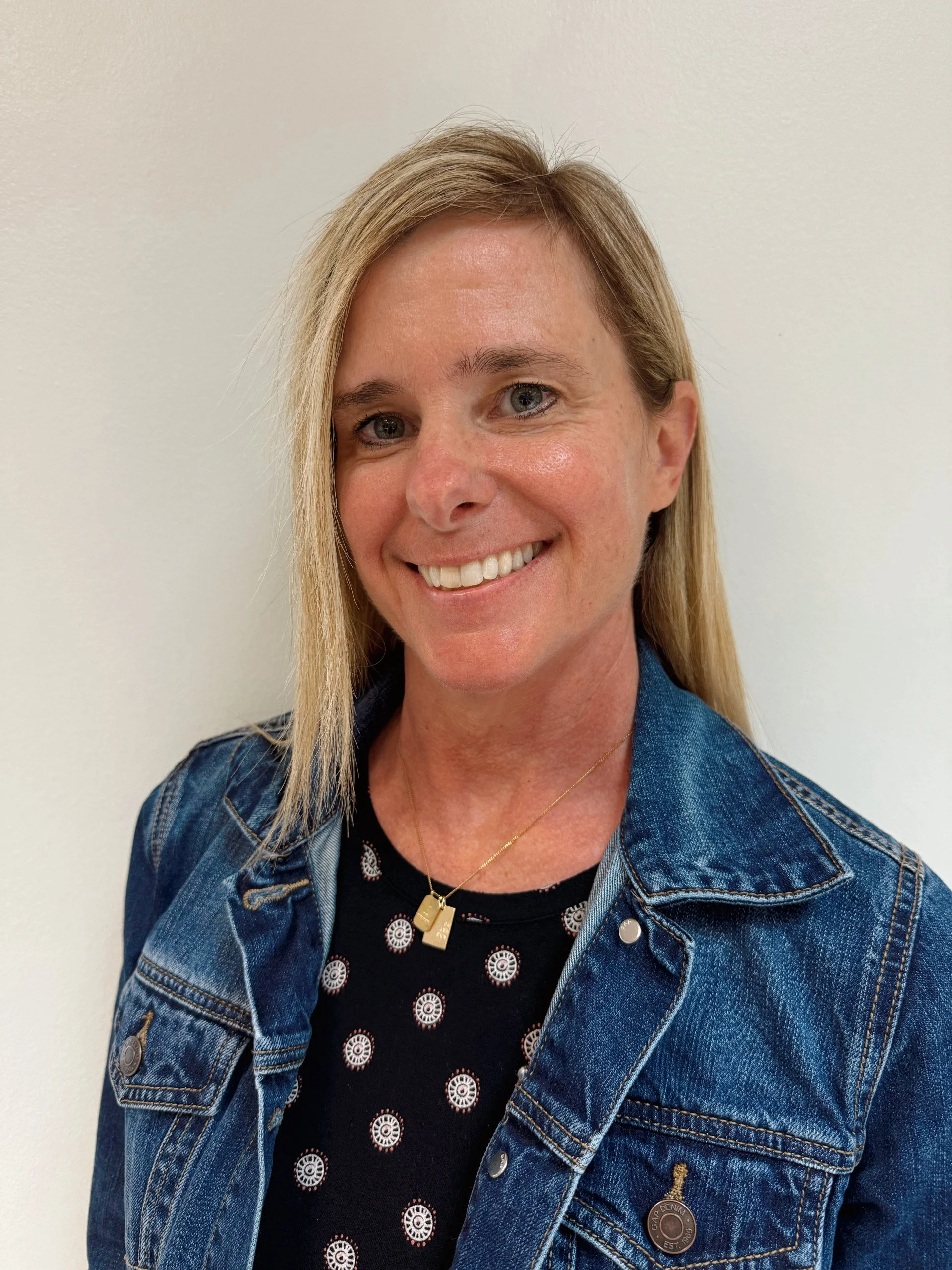 A woman with blonde hair smiling, wearing a denim jacket and a black blouse with a circular pattern, standing against a plain white wall.